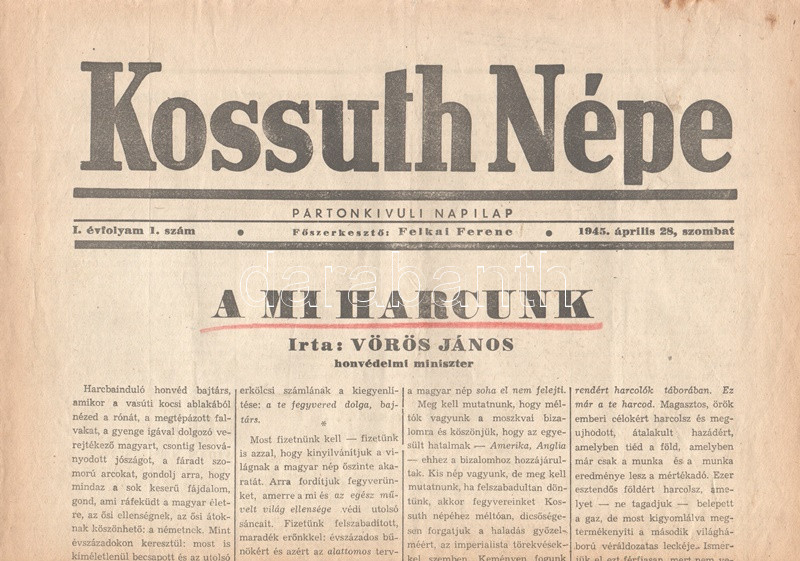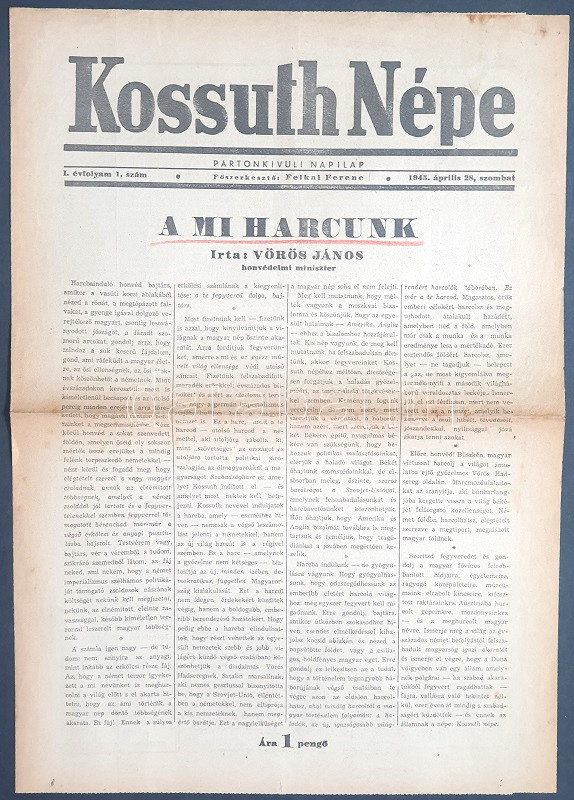 [II. Világháború] Kossuth Népe. 1945. április 28. (Napilap, I. évfolyam, 1. szám) "A mi harcunk -- Gyorsan és szigorúan folynak a tiszti igazoltatások -- Az SS-tábornok barátnője." Félbehajtva, jó állapotban.