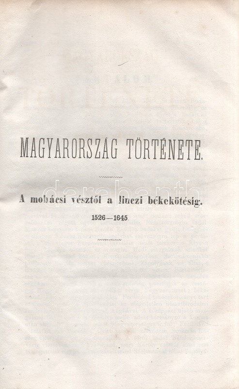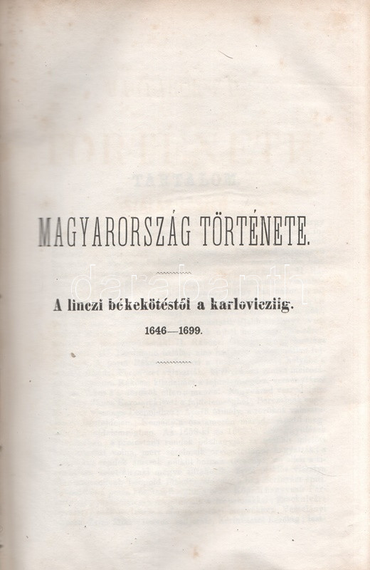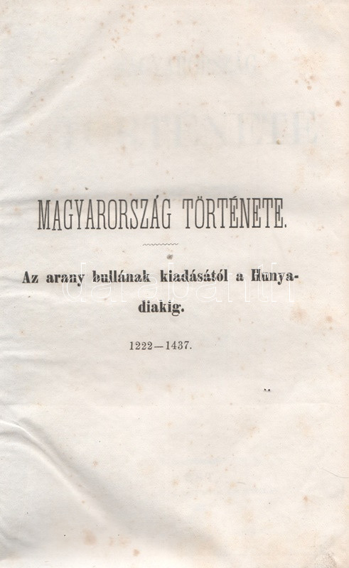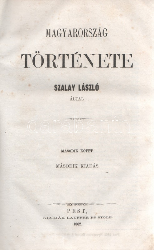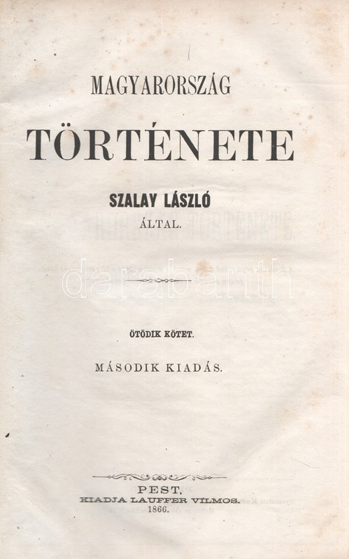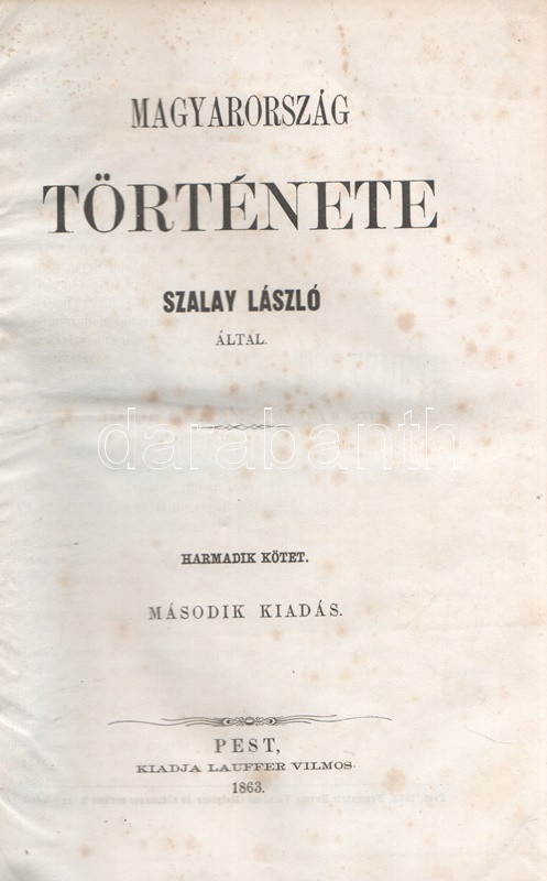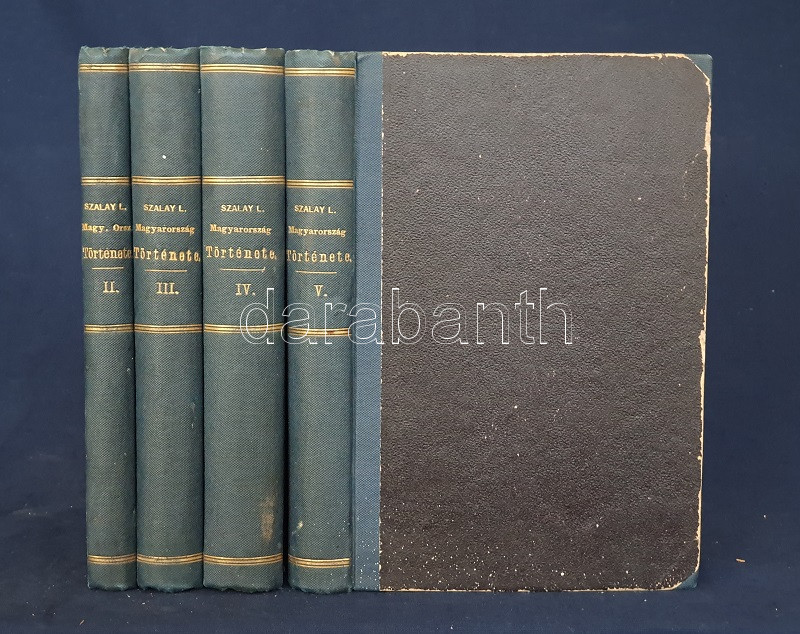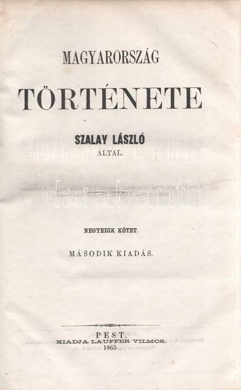 Szalay László: Magyarország története Szalay László által. II-V. kötet. [Négy kötetben.] Pest, 1862-1866. Kiadják Lauffer és Stolp - Kiadja Lauffer Vilmos (Nyomatott Beimel J. és Kozma Vazulnál - Nyomatott Kocsi Sándor által). XVI + 439 + [1] p.; XII + 636 p.; XII + 647 + [1] p.; VIII + 575 + [1] p. Szalay László (1813-1864) jogász, történész, szabadelvű politikus és publicista, MTA-titkár; a késő reformkorban előbb Kölcsey Ferenc, Kossuth Lajos, majd Eötvös József köréhez tartozott, a szabadságharc alatt az igazságügy-minisztérium munkatársaként Deák Ferenc köréhez. Svájci emigrációjában írta meg Magyarország-történetét, melynek első kiadása 1852-1854 között jelent meg, négy kötetben. Példányunk az 1861-1866 között hat kötetben megjelent második kiadásból való. Az olvasmányos stílusban megírt, mértéktartó történelmi munka a kezdetektől a szatmári békekötésig követi nyomon az ország belharcait, alkotmánytörténetét, politikai intézményeinek fejlődését. Példányunk köteteinek beosztása: II. Az arany bullának kiadásától a Hunyadiakig. 1222-1437. - III. A Hunyadiaktól a mohácsi vészig. 1437-1526. - IV. A mohácsi vésztől a linczi békekötésig. 1526-1645. - V: A linczi békekötéstől a karloviczi [béké]ig. 1646-1699. Egységes, aranyozott gerincű korabeli félvászon kötésben. Jó példány.