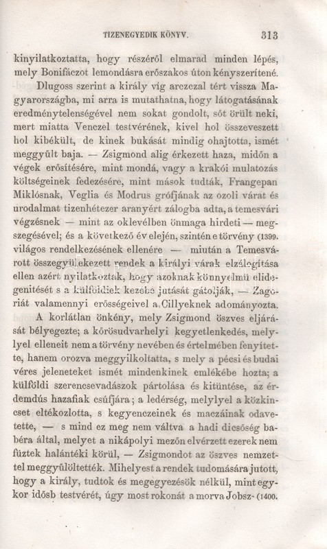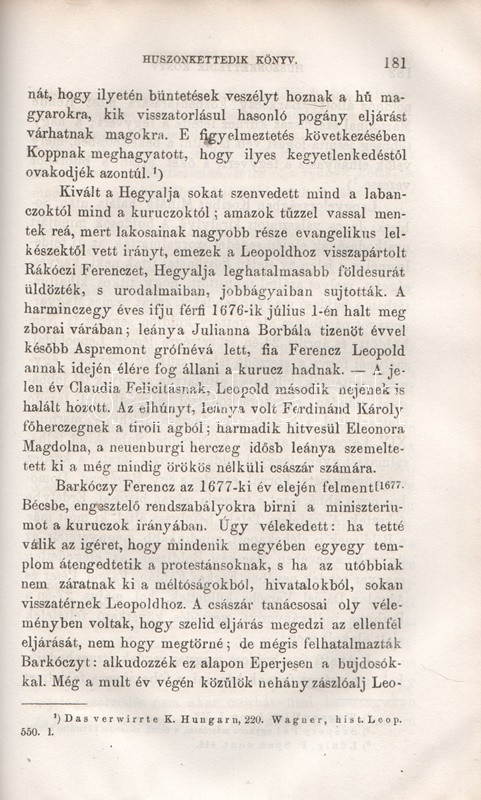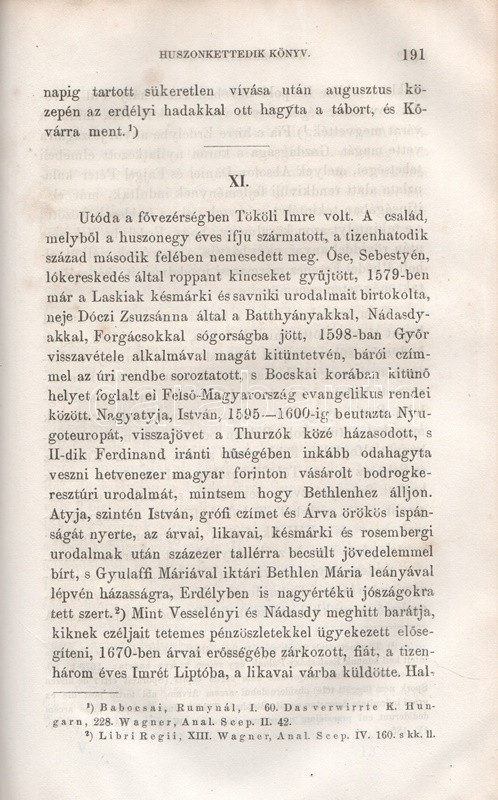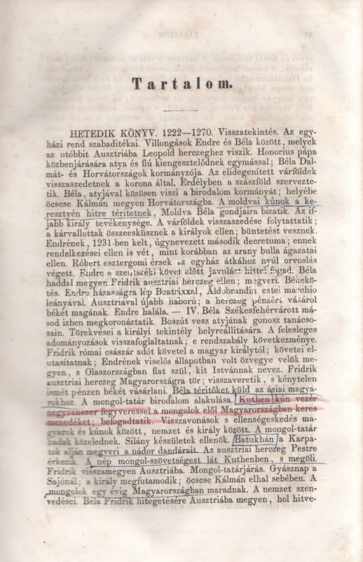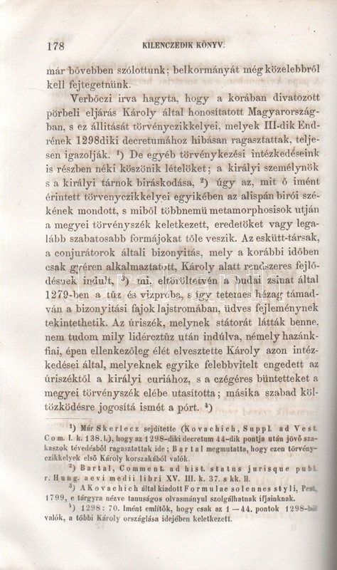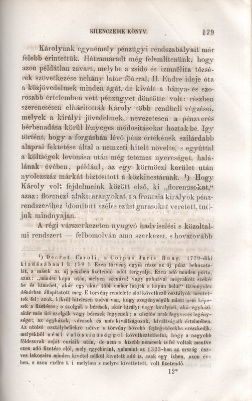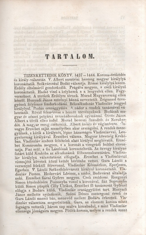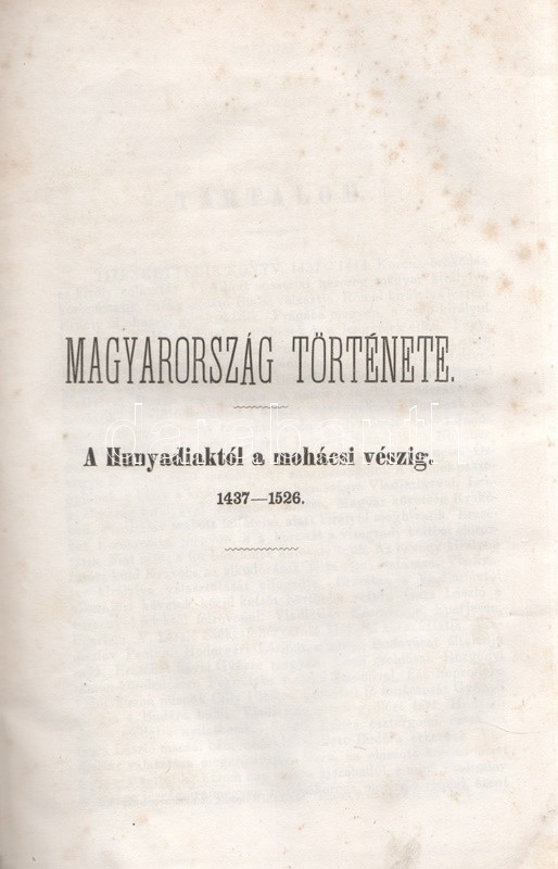 Szalay László: Magyarország története Szalay László által. II-V. kötet. [Négy kötetben.] Pest, 1862-1866. Kiadják Lauffer és Stolp - Kiadja Lauffer Vilmos (Nyomatott Beimel J. és Kozma Vazulnál - Nyomatott Kocsi Sándor által). XVI + 439 + [1] p.; XII + 636 p.; XII + 647 + [1] p.; VIII + 575 + [1] p. Szalay László (1813-1864) jogász, történész, szabadelvű politikus és publicista, MTA-titkár; a késő reformkorban előbb Kölcsey Ferenc, Kossuth Lajos, majd Eötvös József köréhez tartozott, a szabadságharc alatt az igazságügy-minisztérium munkatársaként Deák Ferenc köréhez. Svájci emigrációjában írta meg Magyarország-történetét, melynek első kiadása 1852-1854 között jelent meg, négy kötetben. Példányunk az 1861-1866 között hat kötetben megjelent második kiadásból való. Az olvasmányos stílusban megírt, mértéktartó történelmi munka a kezdetektől a szatmári békekötésig követi nyomon az ország belharcait, alkotmánytörténetét, politikai intézményeinek fejlődését. Példányunk köteteinek beosztása: II. Az arany bullának kiadásától a Hunyadiakig. 1222-1437. - III. A Hunyadiaktól a mohácsi vészig. 1437-1526. - IV. A mohácsi vésztől a linczi békekötésig. 1526-1645. - V: A linczi békekötéstől a karloviczi [béké]ig. 1646-1699. Egységes, aranyozott gerincű korabeli félvászon kötésben. Jó példány.
