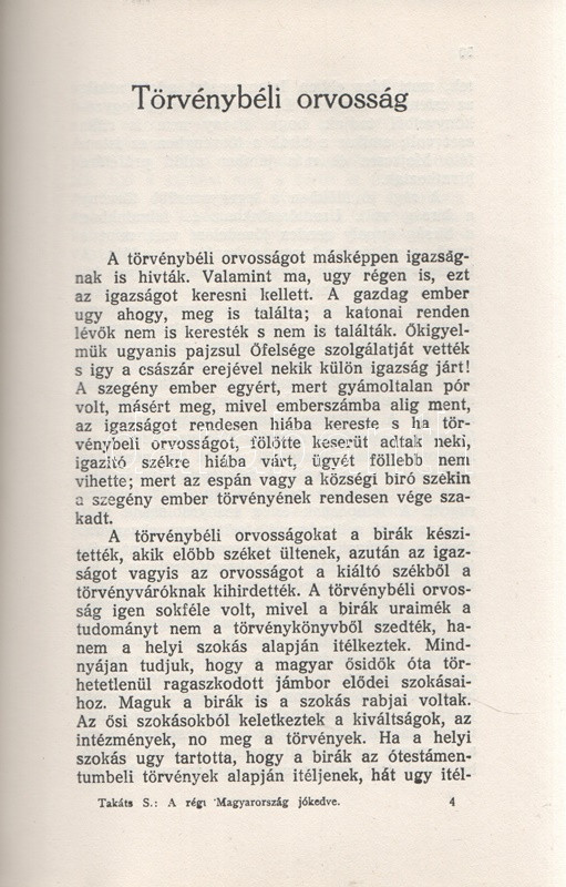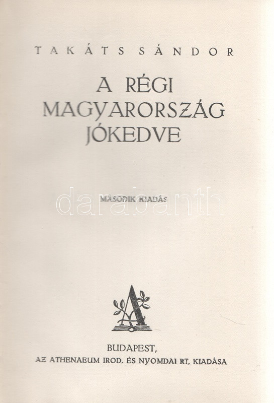 Takáts Sándor: A régi Magyarország jókedve. Budapest, [1929]. Athenaeum Irodalmi és Nyomdai Rt. 223 + [1] p.; [225]-400 + [2] p. Takáts Sándor (1860-1932) művelődéstörténész, piarista szerzetes, középiskolai tanár, a Kisfaludy-Társaság és az MTA tagja. Elsősorban a XVI-XVII. század mindennapjainak történetét kutatta, levéltári források alapján. A munka első kiadása 1921-ben jelent meg, példányunk a második kiadásból való. Egységes, aranyozott gerincű, vaknyomásos kiadói egészvászon kötésben. Jó példány.