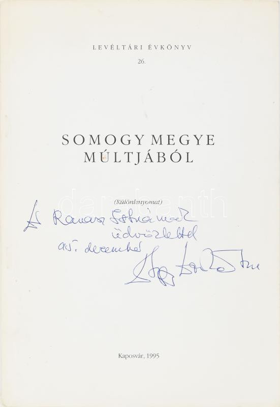 Nagy Domokos Imre: Fejezetek az iharosi-iharosberényi uradalmak vadászattörténetéből. (Dedikált!) Somogy megye múltjából - Levéltári évkönyv 26. (Különlenyomat). Kaposvár, 1995, magánkiadás, 97-140 p. Kiadói tűzött papírkötés, a gerincen minimális sérüléssel. A szerző által dedikált példány.