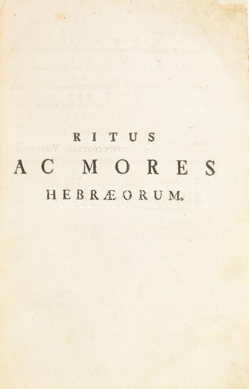[Barkóczi Rosty Miklós (1730-1767)] Nicolao Rosty: Ritus ac mores hebraeorum italico idiomate refutati a doctore Paolo Medici, nunc aditis quibusdam Latine redditi, notisque Hebraicis illustrati a. R. P. Nicolao Rosty ... Tyrnaviae [Nagyszombat], 1758, Typis Academicis Societatis Jesu, 9 sztl. lev.+276 p.+ 2 sztl. lev. A szerző Padányi Bíró Márton veszprémi püspöknek ajánlotta a könyvét. Átkötött kartonált papírkötés, kissé foltos lapokkal, a lapok sarkain restaurációval, possessori bejegyzésekkel.