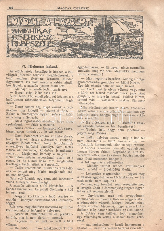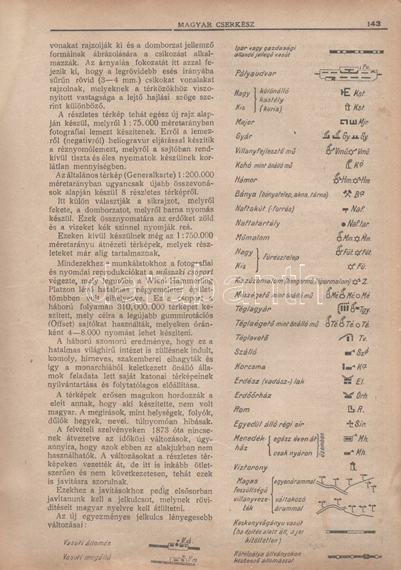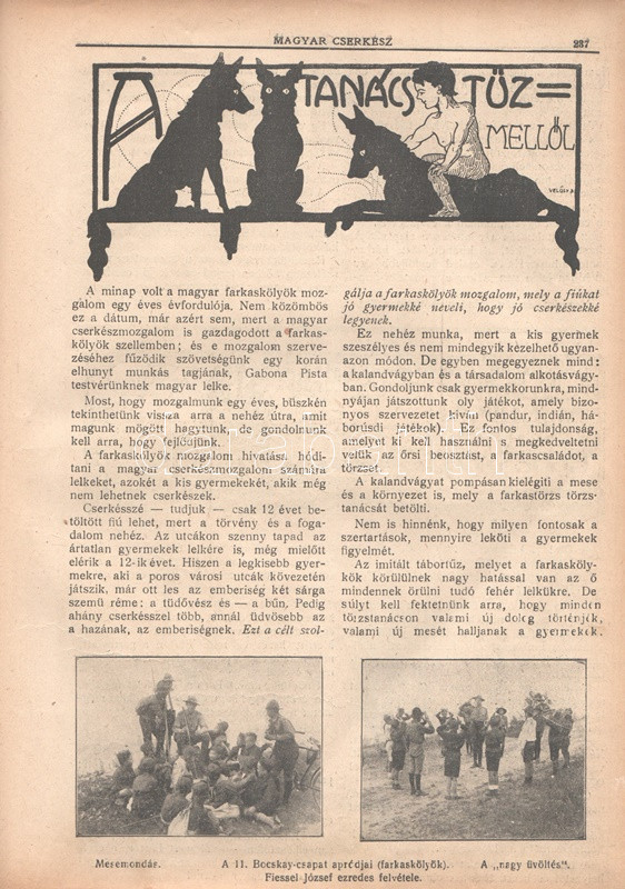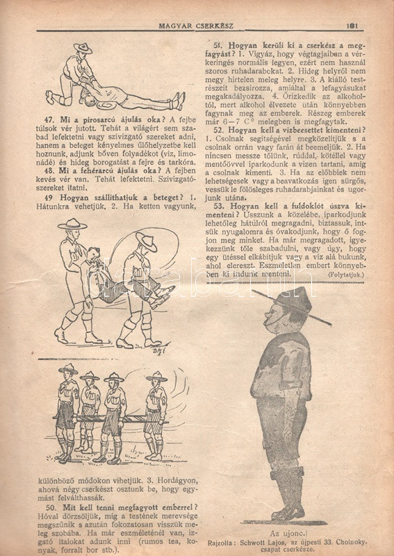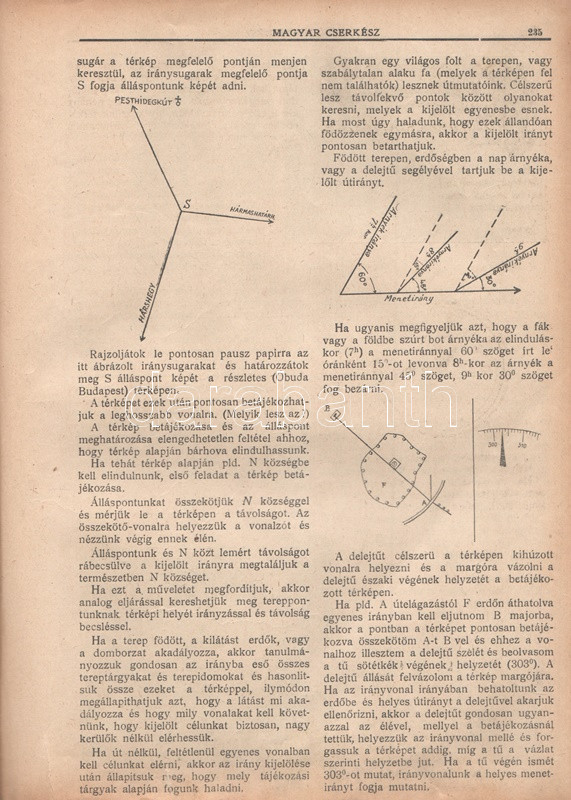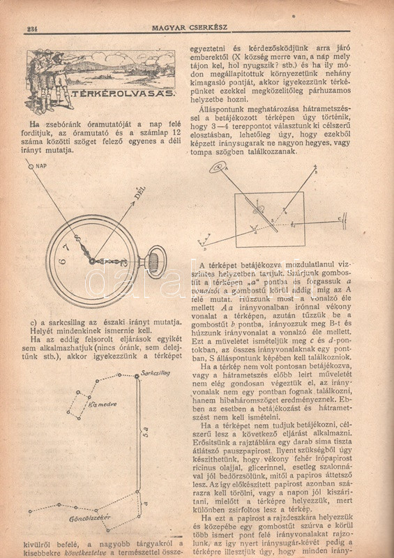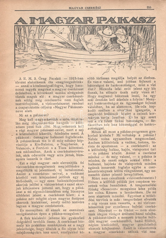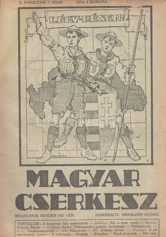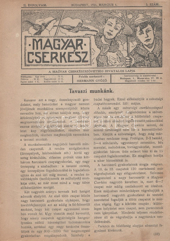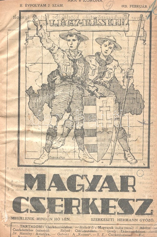 Magyar Cserkész. A Magyar Cserkészszövetség hivatalos lapja. Szerkeszti: Hermann Győző. Megjelenik minden hó 1-én. II. évfolyam, 2-12., III. évfolyam, 1-12. szám. (1921. február - 1922. december). [Egybekötve.] Budapest, 1921-1922. (Fráter és Társa ny.) [21]-267 + [1] p.; 263 + [1] p. Az Angliában 1907-ben indult cserkészmozgalomról először 1910-ben számolt be az ifjúsági sajtó, ugyanebben az évben pedig meg is alakultak az első magyar cserkészcsapatok, a Magyar Cserkészszövetség pedig két évre rá, 1912-ben létesült. A természetjárást, természetszeretetet, természetismeretet, életrevalóságot, segítőkészséget, hazafiasságot, honismeretet, bajtársiasságot és valláserkölcsi nevelést célul kitűző ifjúsági mozgalmat a Tanácsköztársaság idején betiltották, 1919 őszén alakult újjá, 1920-ban pedig Magyar Cserkész néven elindult önálló periodikája, évi 12 számmal. A cserkészéletből vett szövegközti grafikákkal és cserkészeti ismeretterjesztő ábrákkal gazdagon illusztrált folyóirat hírt ad a nemzetközi cserkészéletről, térképészeti, tájékozódási, táborozási, elsősegély-nyújtási, cserkészeti szakcikkeket közölt, cserkészeti témájú elbeszélések mellett. A lapszámok terjedelme változó: 20-36 oldal terjedelem között mozog. Kötetünk első és utolsó lapszámának egyes levelei kijárnak, a kötet fűzése e helyeken meglazult. Néhány ív fűzése a gerincnél megerősítve, egy címlevélen kisebb pótlás. A II. évfolyam lapszámaiból 4, a III. évfolyam lapszámaiból 6 levél hiányzik. Sérült gerincű, kopottas korabeli félvászon kötésben.