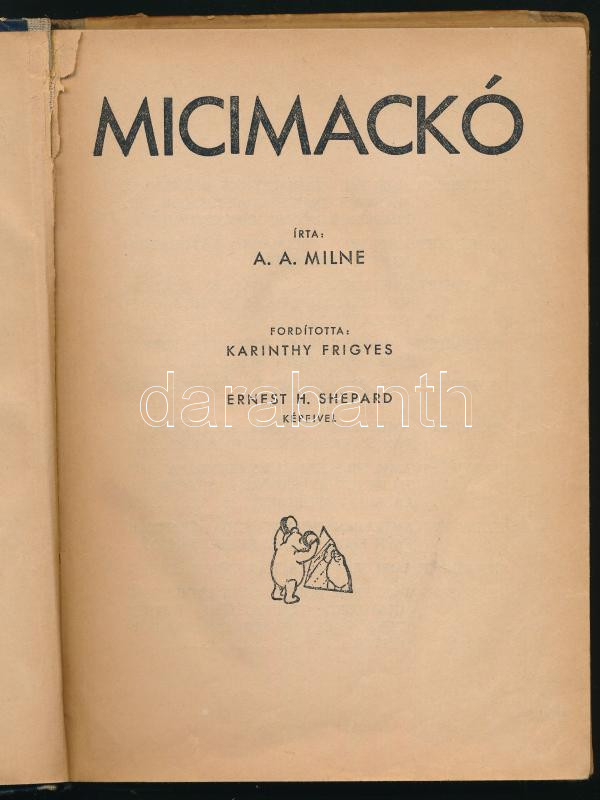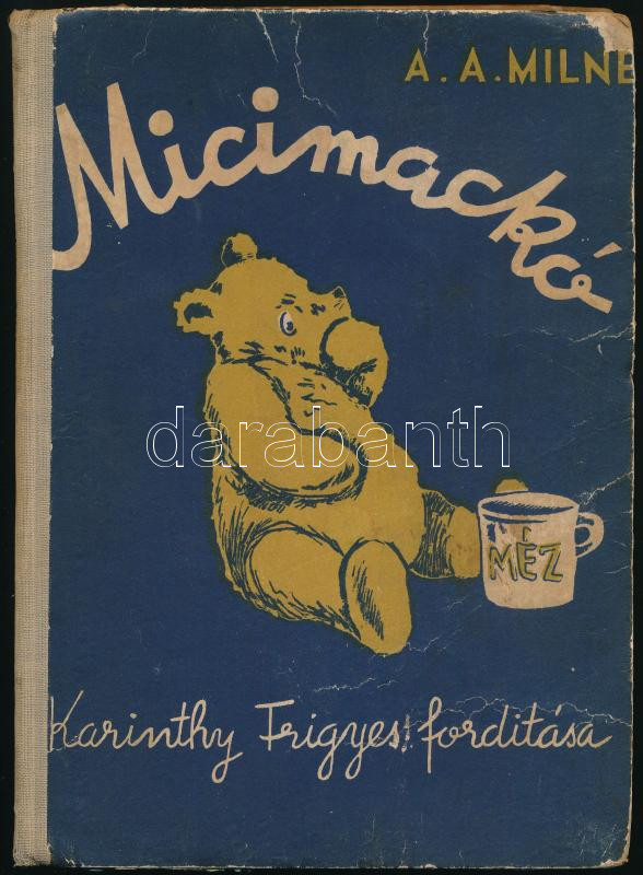 [Milne, Alan Alexander] A. A. Milne: Micimackó. Ford.: Karinthy Frigyes. Ernest H. Shepard képeivel. Bp., 1957, Kossuth (Athenaeum-ny.), 123 p. Szövegközi és egészoldalas, fekete-fehér illusztrációkkal. Kiadói félvászon-kötés, kopottas borítóval.