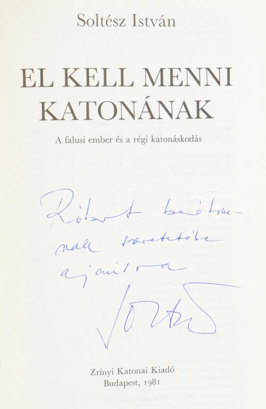 Soltész István: El kell menni katonának. A falusi ember és régi katonáskodás. DEDIKÁLT! Bp., 1981., Zrínyi. Kiadói egészvászon-kötés, kiadói papír védőborítóban.
