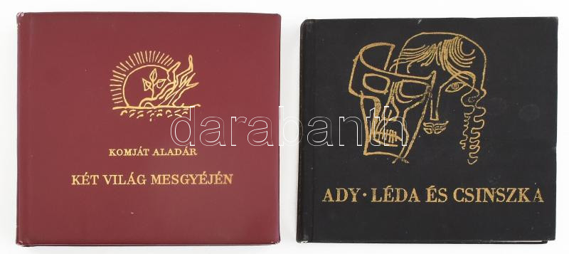 2 db minikönyv (az egyik bőrkötésű, számozott): Komját Aladár: Két világ mesgyéjén. Válogatott versek. Vál., sajtó alá rend. és az utószót írta: Waldapfel József. Reich Károly illusztrációival. Bp., 1962, Magyar Helikon. Kiadói aranyozott egészbőr-kötés, a belső kötéstáblán ex libris-szel. Számozott (218./450) példány. + Ady Endre: Léda és Csinszka. Szász Endre illusztrációival. Bp., 1966, Magyar Helikon. Kiadói egészvászon-kötés, kissé koszos borítóval.