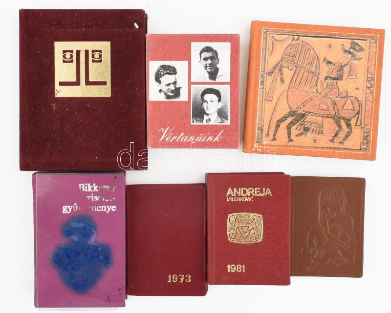 7 db vegyes minikönyv: Vértanúink. Három ifjú kommunista mártír.; Andreja Milenkovic: Postanske marke. (Szerb nyelvű).; Szekszárdi Nyomda 1973-as zsebnaptára.; stb. Változó állapotban.
