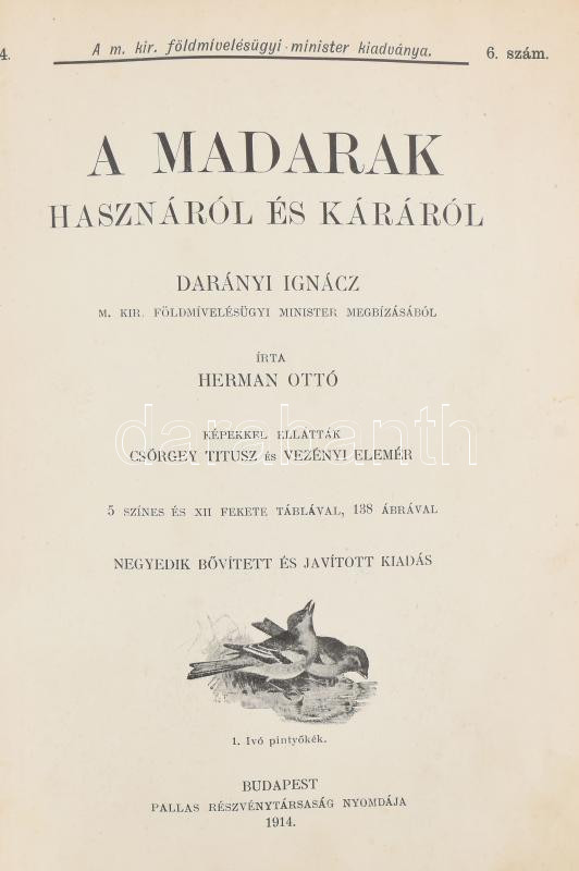 Herman Ottó: A madarak hasznáról és káráról. Darányi Ignácz m. kir. földmivelésügyi minister megbizásából. Képekkel ellátták Csörgey Titusz és Vezényi Elemér. Bp., 1914., Pallas, 404 p. + 5 t (színes táblák) t. Negyedik kiadás. Átkötött félvászon-kötés, kissé kopott borítóval,