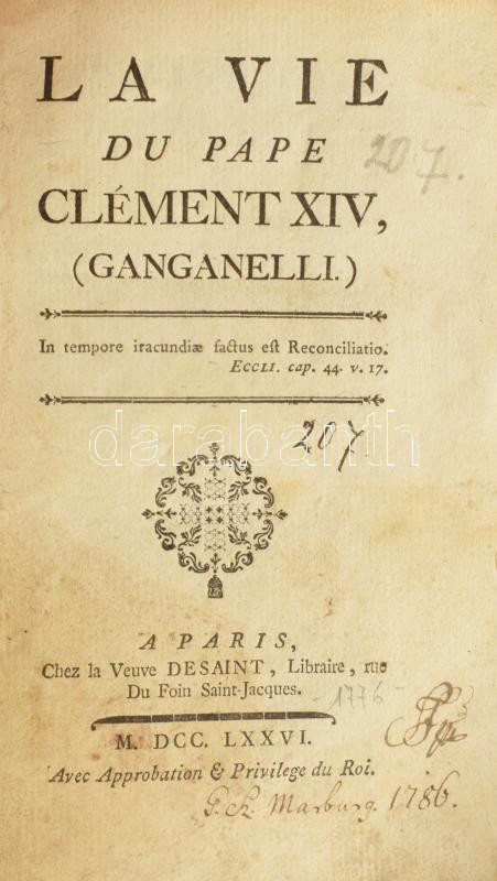 La Vie du Pape Clément XIV, (Ganganelli.) Hozzákötve: M. de Pontallard: Oraison Funebre du Pape Clémment XIV, (Ganganelli.) Paris-Fribourg, 1776-1775, Chez la Veuve Desaint-Chez B. L. Piller, 263+1+48 p. Fancia nyelven. Papírkötés, kopott borítóval, sérült gerinccel, laza fűzéssel.