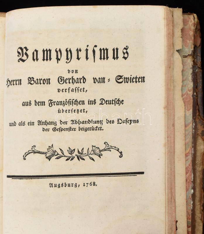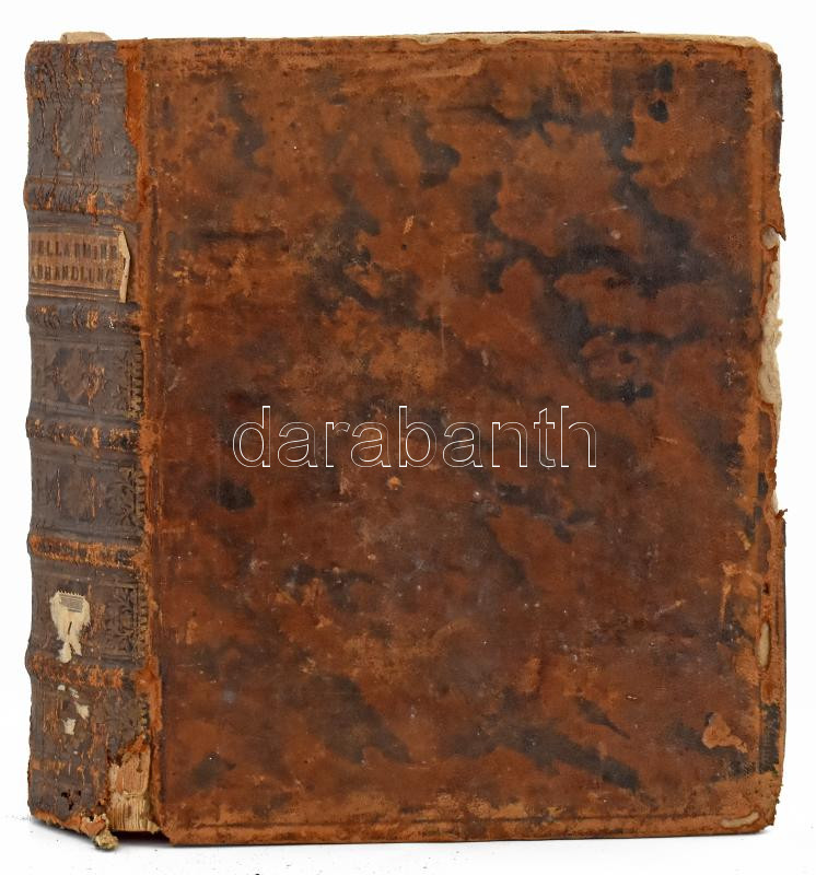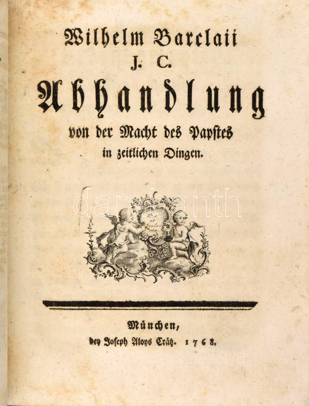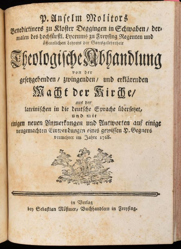Robert Bellarmins der heil. römischen Kirche Cardinals Abhandlung von der Macht des Papstes in zeitlichen Dingen. München, 1768, Joseph Aloys Crätz, 6+2+63 p. Hozzákötve: Wilhelm Barclaii J. C. Abhanglun von der Macht des Papstes in zeitlichen Dingen. München, 1768, Joseph Aloys Crätz,4+222 p. Hozzákötve: P. Anselm Molitors Benedictiners zu Kloster Deggingen in Schwaben, dermalen des hochfürstl. Lyceums zu Freysing Regenten und öffentlichen Lehrers der Gottsgelehrtheit Theologische Abhandlung von der gesetzgebenden, zwingenden, und erklärenden Macht der Kirche, aus der lateinischen in die deutsche Sprache übersetzet, und mit einigen neuen Anmerkungen und Antworten auf einige neugemachten Einwendungen eines gewissen H. Gegners vermehrt im Jahre 1768. Freysing [Freising], 1768, Sebastian Mößmer, 120+2 p. Hozzákötve: Abhandlung des Daseyns der Gespenster, nebst einem Anhange vom Vampyrismus. Augsburg, 1768, nyn., 174 p. Hozzákötve: Vampyrismus von Herrn Baron Gerhard van Swieten verfasset, aus dem Französischen ins Deutsche übersetzet, und als ein Anhang der Abhandlung des Daseyns des Gespenster beigerücket. Augsburg, 1768., nyn., 23+3 p. Korabeli egészbőr-kötés, kopott borítóval, a gerincen és az elülső kötéstábla szélén kis sérüléssel, részben foltos lapokkal.