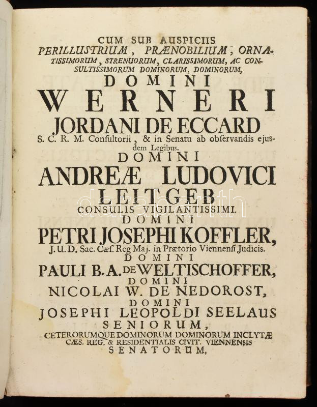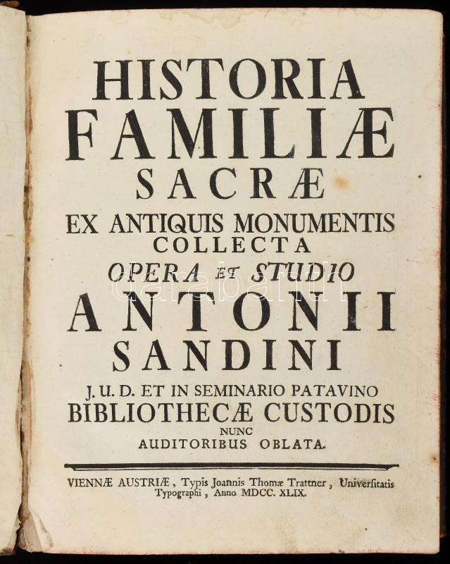 [Sandini, Antonio (1692-1730)] : Historia Familiae Sacrae ex antiquis monumentis collecta opera et studio Antonii Sandinii ... Wiennae, 1749, Typis Joannis Trattner, 1 t. + 10 sztl. lev. + 335 p. Latin nyelven. Korabeli egészbőr-kötés, kopott borítóval, a borítókon a bőrön kis hiányokkal, sérült, részben hiányos gerinccel, a címlapon és a címképen kis szakadással, foltos lapokkal, possessori bejegyzéssel.