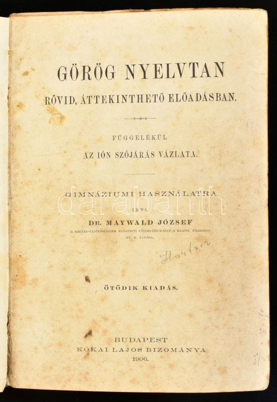 Maywald József: Görög nyelvtan. Rövid, áttekinthető előadásban. Függel... https://www.darabanth.com/de/471-Fernauktion/471.0/Bucher/Bucher-Sozialwissenschaften~1000028/Maywald-Jozsef-Gorog-nyelvtan-Rovid-attekintheto-eloadasban-Fuggelekul-az-ion-szojC3~II2994647
