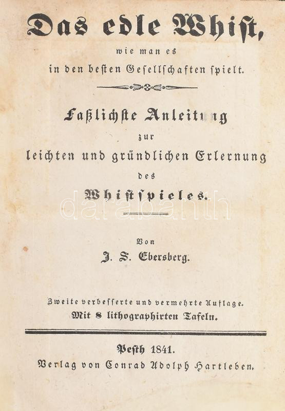 Ebersberg, Josef Sigmund: Das edle Whist, wie man es in den besten Gesellschaften spielt. Pesth, 1841, Verlag von Conrad Adolph Hartleben. Egészvászon kötés, kopottas állapotban.