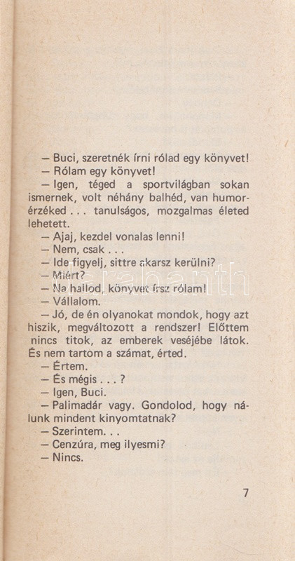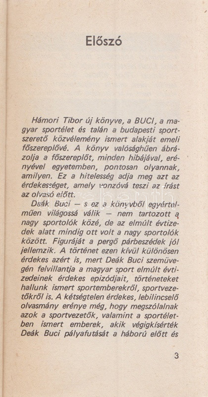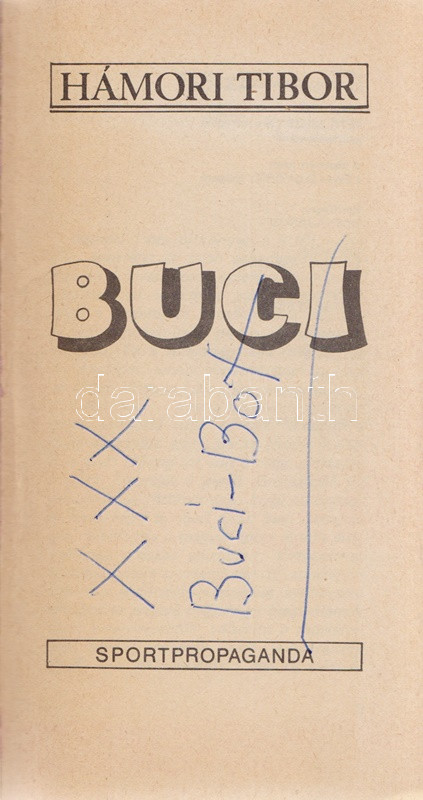 Hámori Tibor: Buci. (Dedikált.) [Budapest], 1984. Sportpropaganda Vállalat (Egyetemi Nyomda). 167 + [1] p. Egyetlen kiadás. A címlapon Deák Róbert (Buci) által dedikált: ,,XXX BUCI-BOX.'' Sajátos humorú interjúkötet Deák Róbert (Buci)-val, a könnyűsúlyú bokszolóval. Fűzve, Buci fényképével illusztrált kiadói borítóban.