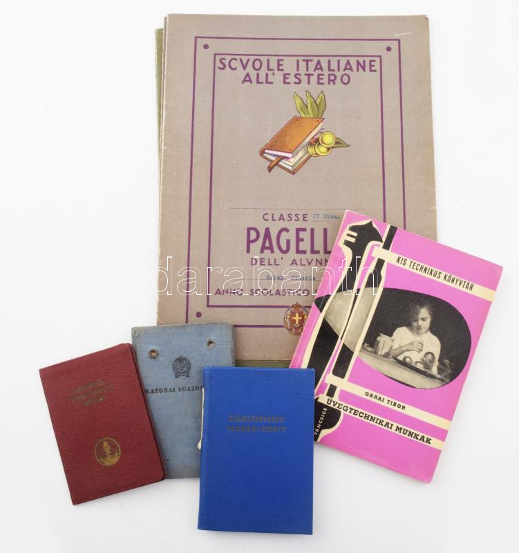 Garai Tibor: Üvegtechnikai munkák. Kis Technikus Könyvtár. Bp., 1963, Táncsics. Kiadói papÃrkötés. Megjelent 4400 példányban. + A szerzÅ‘, Garai Tibor össz. 7 db okmánya: katonai igazolvány (fényképpel és aláÃrással), Tudományos IsmeretterjesztÅ‘ Társulat tagsági igazolvány, szakszervezeti tagsági könyv, valamint 4 db iskolai bizonyÃtvány, olasz nyelven (R. Scuola Italiana ,,Eugenio di Savoia" di Budapest / Budapesti Savoyai JenÅ‘ Olasz Királyi Iskola)