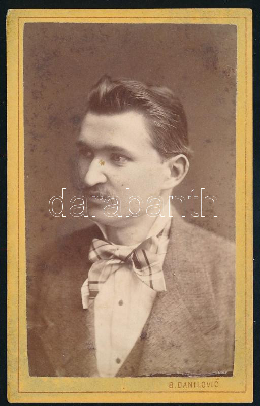 cca 1880 Fiatal férfi portréja, keményhátú fotó B. Danilovic temesvári fényképész műterméből, 10,5x6 cm / Timisoara, vintage photo from the studio of B. Danilovic, 10,5x6 cm