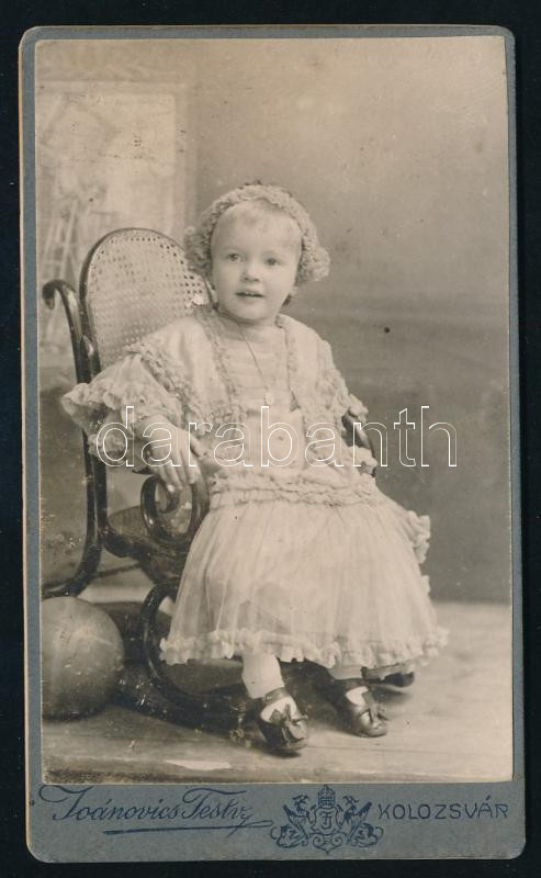 Beschreibung: cca 1910 Kislány hintaszékben, keményhátú fotó Joánovics Testvérek kolozsvári műterméből, 10,5x6,5 cm