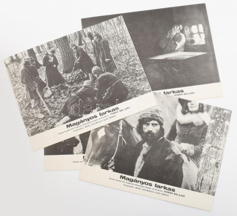 cca 1989 előtt készült ,,Magányos farkas" című szovjet film jelenetei és szereplői, 6 db produkciós filmfotó (vitrinfotó, lobbyfotó) nyomdatechnikával sokszorosítva kartonpapírra, egyoldalas nyomással, a használatból eredő (esetleges) kisebb hibákkal, 18x24 cm