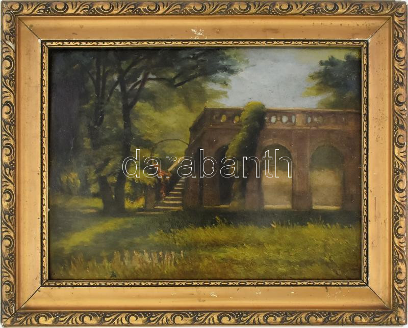 Beschreibung: Ágotha Imre (1860-1930): Epreskert. Olaj, karton. Jelzés nélkül, hátoldalán fleiratozott. 26,5x35,5 cm. Dekoratív, kissé sérült fakeretben.