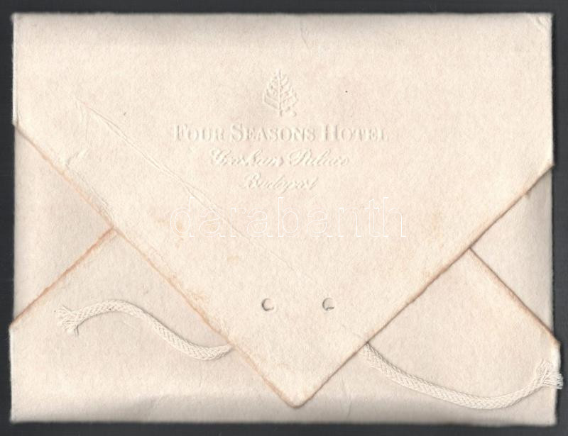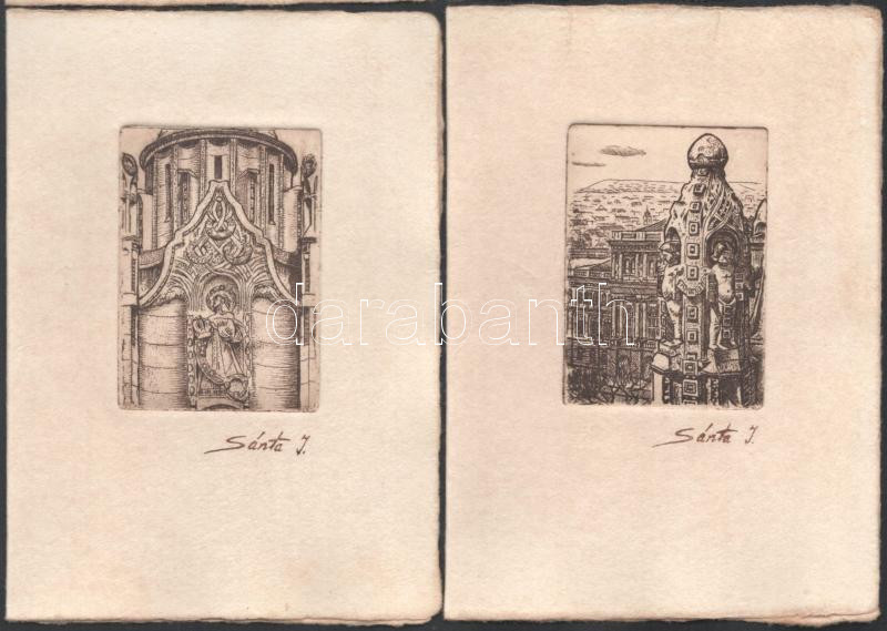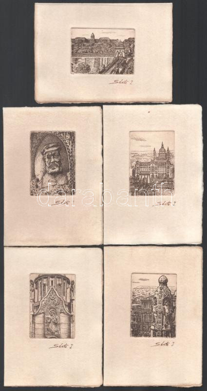 Sánta István (1957-), össz. 5 db mű: Budapesti panoráma, Gresham palota részletei és portré. Rézkarc, merített papír, mindegyik jelzett. 7x5 cm. Four Seasons Hotel Gresham Palace Budapest feliratos merített papír borítékban.