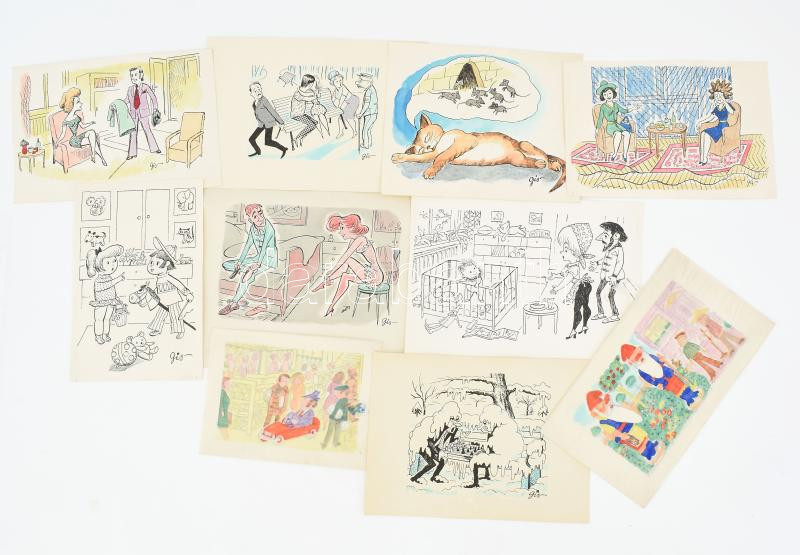Beschreibung: SzegÅ‘ Gizi (1902-1985): Karikatúrák vázlatai, 10 db. Vegyes technika, papÃr, mind jelzett. Mindegyik hátoldalán "Ludas Matyi SzerkesztÅ‘sége" vagy "Ludas Magazin" bélyegzÅ‘vel. 12,5x16 cm és 18,5x20,5 cm közötti méretekben.