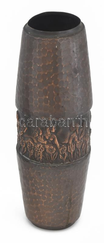 Beschreibung: Iparművész réz váza virágszedő lányok plasztikus relieffel. Jelzés nélkül, 25 cm