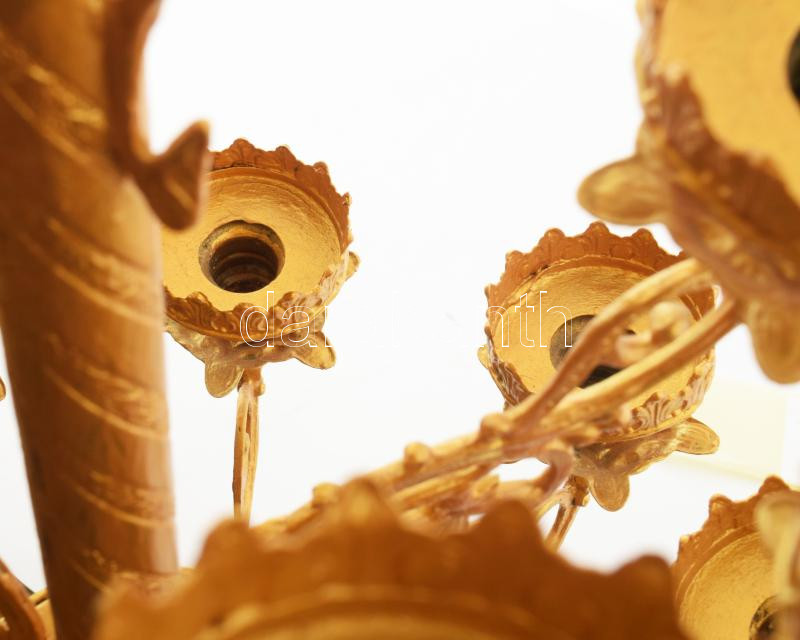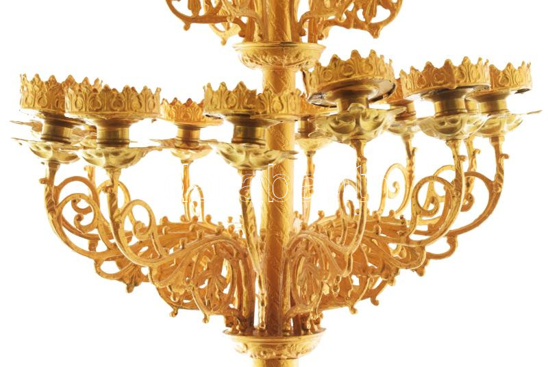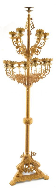 Nagyméretű templomi sokágú aranyszínű gyertyatartó, 1 elvált darabbal, újrafestett, kétfelé szedhető, m: 143 cm, talp d: 36 cm /// KIZÁRÓLAG SZEMÉLYES ÁTVÉTEL, NEM POSTÁZZUK / ONLY PERSONAL COLLECTION IN OUR OFFICE!