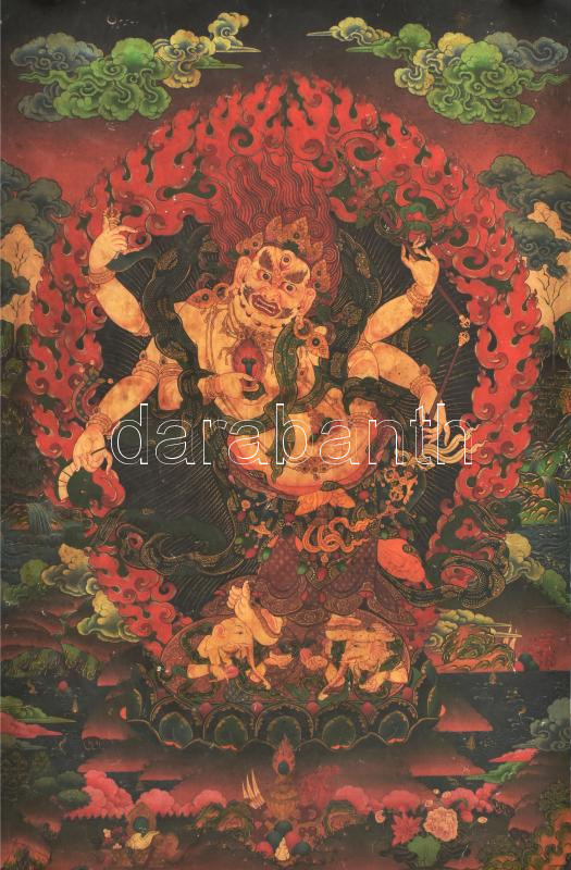 Beschreibung: Thangka, Hayagriva ábrázolással. Kína, XX. sz. első fele, nyomat, vászon. 88x60 cm, korának megfelelő állapotban, hátul kopott és foltos, feltekerve.
