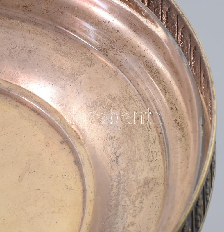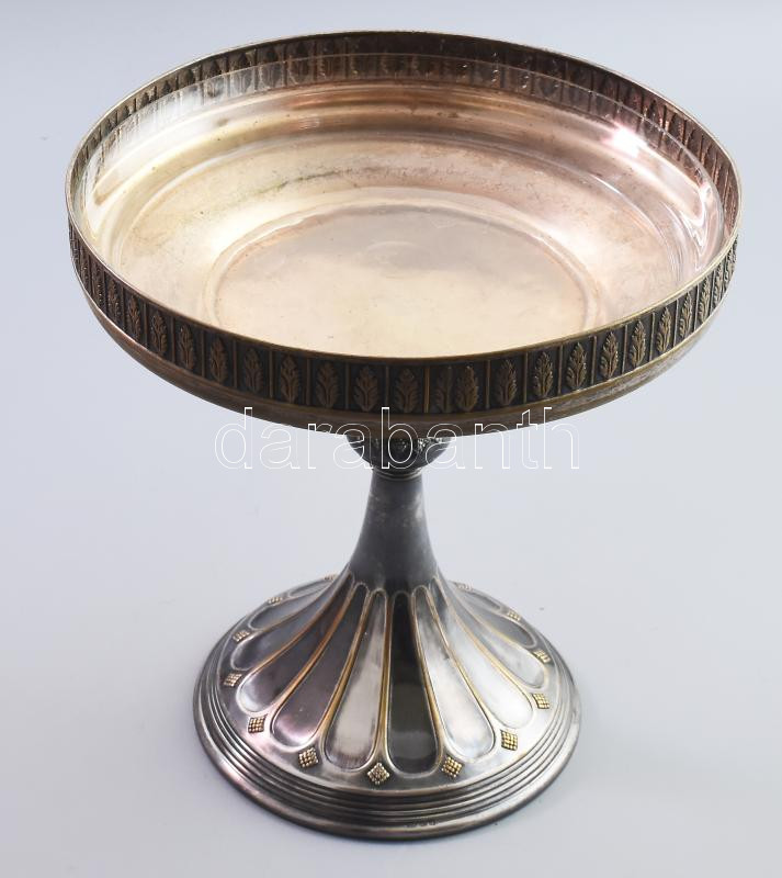 Beschreibung: WMF szecessziós ezüstözött alpakka kínáló, kissé pattogzott üveg betéttel, jelzett, kopással, d: 21,5 cm, m: 22,5 cm