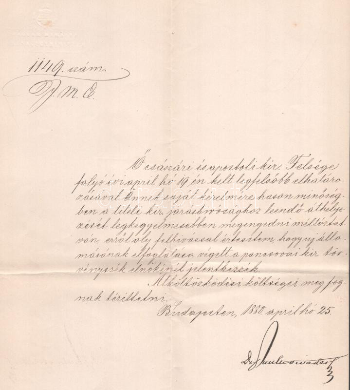 Beschreibung: 1880 Pauler Tivadar (1816-1886) igazságügy-miniszter által aláírt okirat, fejléces miniszteri papíron, Sárdy János bíró, Kézdi-Kovács László festőművész, műkritikus nászurának részére kiállított titelii bírói áthelyezési okmányán, kisebb szakadással