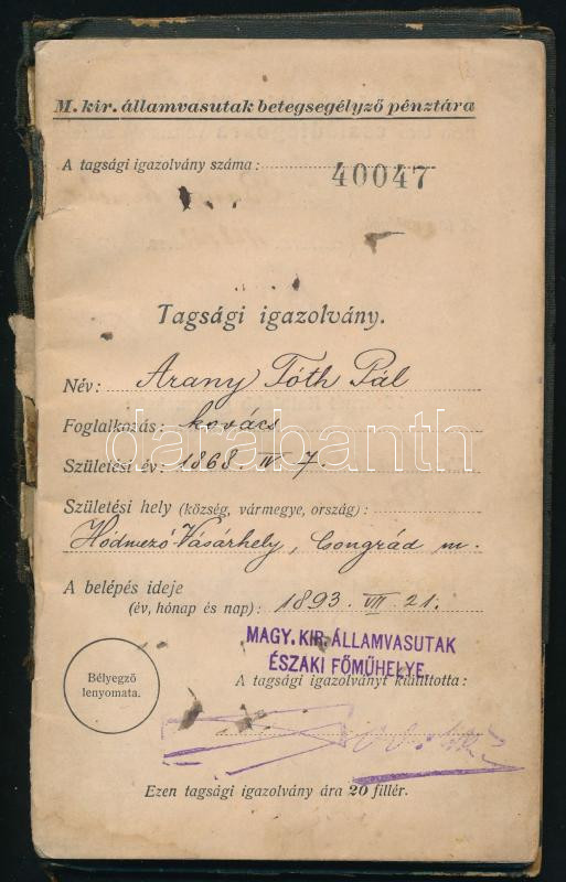 1893 M. Kir. Államvasutak betegsegélyező pénztára tagsági igazolvány https://www.darabanth.com/de/471-Fernauktion/471.0/Kunst-Dokumente-andere-Sammelgebiete/Dokument~2000107/1893-M-Kir-Allamvasutak-betegsegelyezo-penztara-tagsagi-igazolvany~II3043575