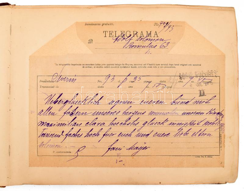 1903 Házassági gratuláló táviratok, emlékkönyvbe ragasztva, sérült. https://www.darabanth.com/de/471-Fernauktion/471.0/Kunst-Dokumente-andere-Sammelgebiete/Dokument~2000107/1903-Hazassagi-gratulalo-taviratok-emlekkonyvbe-ragasztva-serult~II3146655