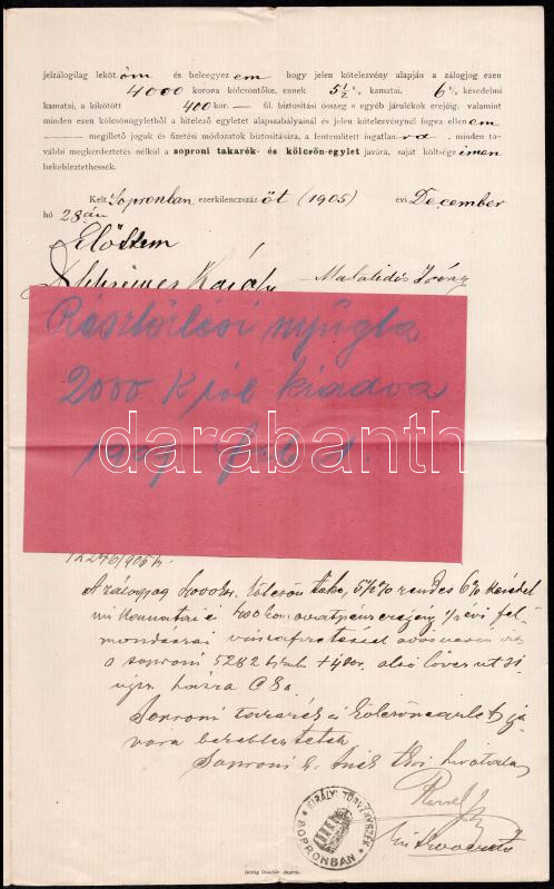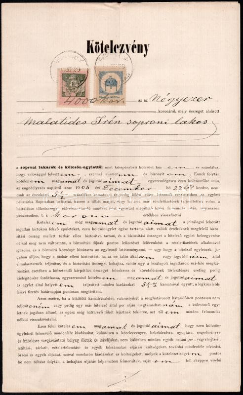 Beschreibung: 1905 Sopron, kötelezvény a 'Soproni Takarék és Kölcsön-Egylettől' 4000 koronáról, a soproni Malatides-család egy hölgytagja részére, 10 K és 2 K 50 F okmánybélyegekkel, pecsétekkel.