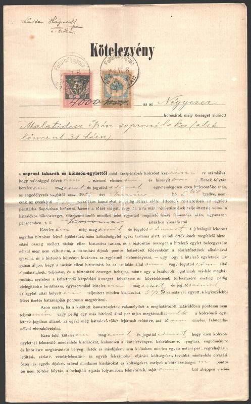1905 Soproni Takarék és Kölcsön egylet kötelezvény illetékbélyeggel https://www.darabanth.com/de/471-Fernauktion/471.0/Kunst-Dokumente-andere-Sammelgebiete/Dokument~2000107/1905-Soproni-Takarek-es-Kolcson-egylet-kotelezveny-illetekbelyeggel~II3117948