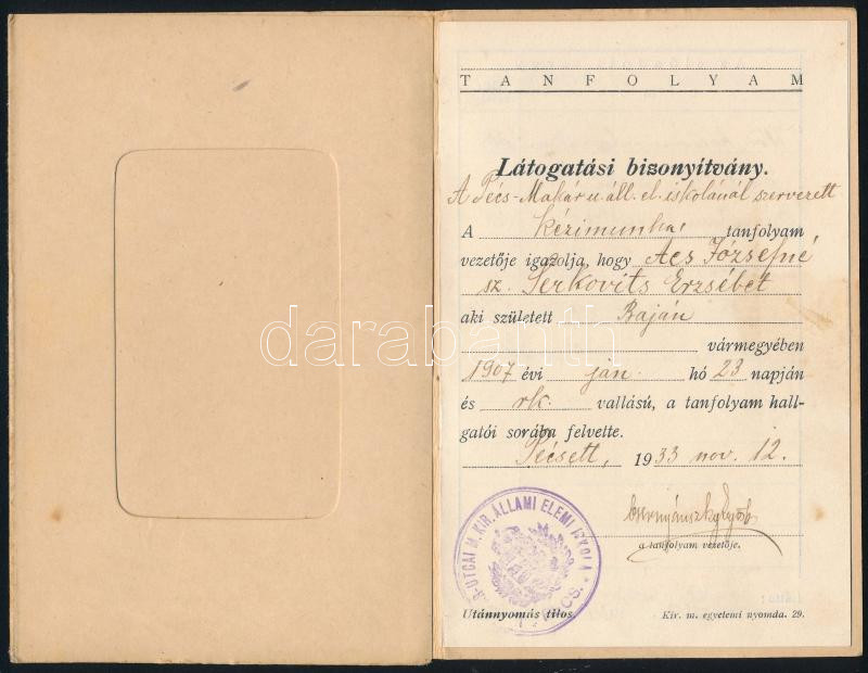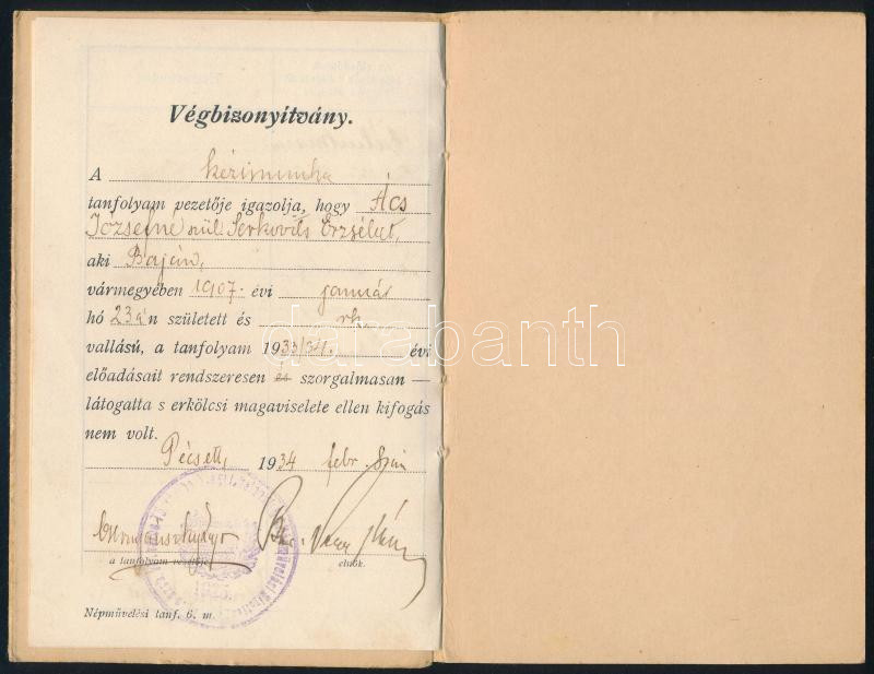 1933 Pécs, Makár utcai iskolánál szervezett kézimunka-tanfolyam látoga... https://www.darabanth.com/de/471-Fernauktion/471.0/Kunst-Dokumente-andere-Sammelgebiete/Dokument~2000107/1933-Pecs-Makar-utcai-iskolanal-szervezett-kezimunka-tanfolyam-latogatasi-bizonyitvanya-a~II3111558