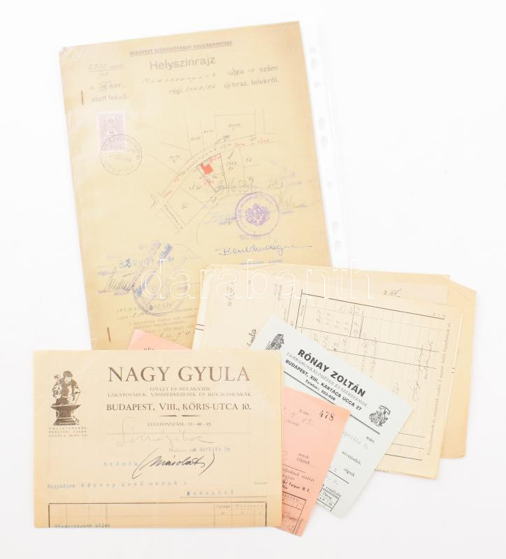 1938-44 Bp., helyszínrajz a XII. ker., Miasszonyunk útja (később Meredek u.) 38 sz. alatti telekről és azon építendő villáról, ifj. Benkhard Ágost (1910-1967) építész autográf aláírásával + 10 db kivitelezői számla + 1 db egyéb számla 1921-ből