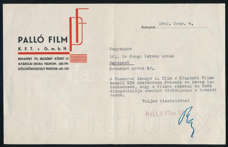 1942 Bp., Palló Film Kft. fejléces levele a Szamuráj leánya című film ... https://www.darabanth.com/de/471-Fernauktion/471.0/Kunst-Dokumente-andere-Sammelgebiete/Dokument~2000107/1942-Bp-Pallo-Film-Kft-fejleces-levele-a-Szamuraj-leanya-cimu-film-ugyeben-hajtott~II3186726