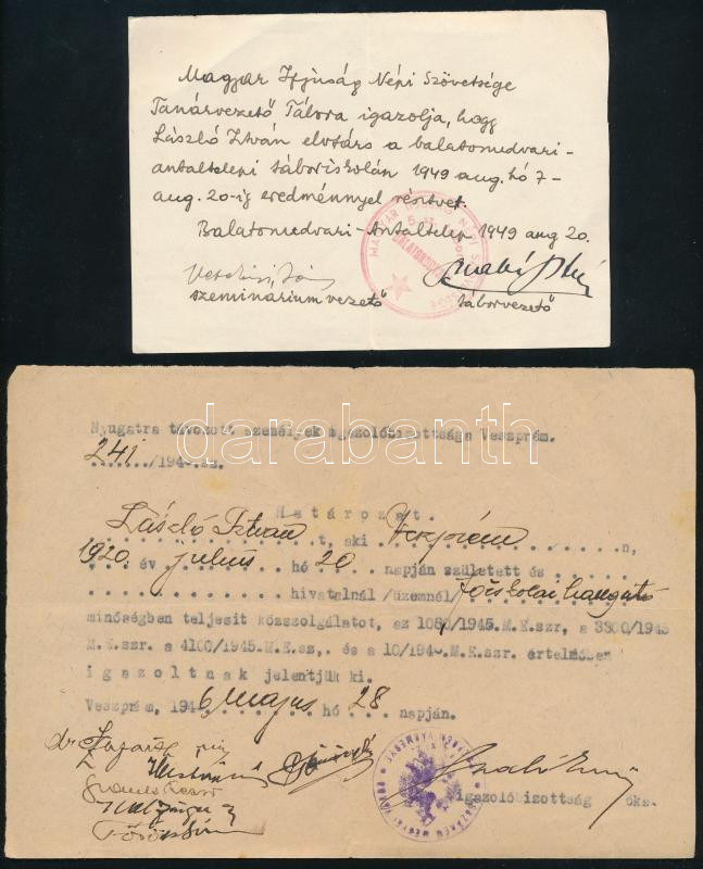 1946-49 Ugyanazon személy részére kiállított 2 db okmány: 1946 Veszprém, Nyugatra távozott személyek igazolóbizottsága által kiállított igazolás és 1949 Balatonudvari, igazolás Magyar Ifjúság Népi Szövetsége Tanárvezető Táborán való részvételről, mindkettőn beazonosítandó aláírásokkal
