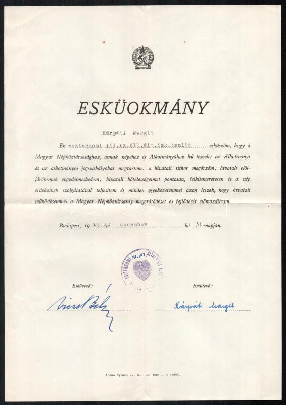 1947-1952 Kárpáti Margit esztergomi tanítónő 4 db okmánya (igazolvány,... https://www.darabanth.com/de/471-Fernauktion/471.0/Kunst-Dokumente-andere-Sammelgebiete/Dokument~2000107/1947-1952-Karpati-Margit-esztergomi-tanitono-4-db-okmanya-igazolvany-kinevezes-eskuokma~II3043569