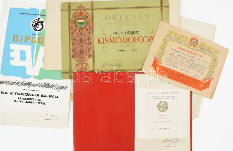 Szocreál oklevél tétel, 28 db, vegyes állapotban https://www.darabanth.com/de/471-Fernauktion/471.0/Kunst-Dokumente-andere-Sammelgebiete/Dokument~2000107/Szocreal-oklevel-tetel-28-db-vegyes-allapotban~II3187396