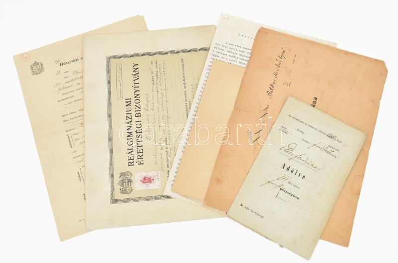 Beschreibung: cca 1860-1942 Vegyes iratok, össz. 8 db, közte adóív, ház lakóinak nyilvántartása, érettségi bizonyítvány, levelek, anyakönyvi kivonatok