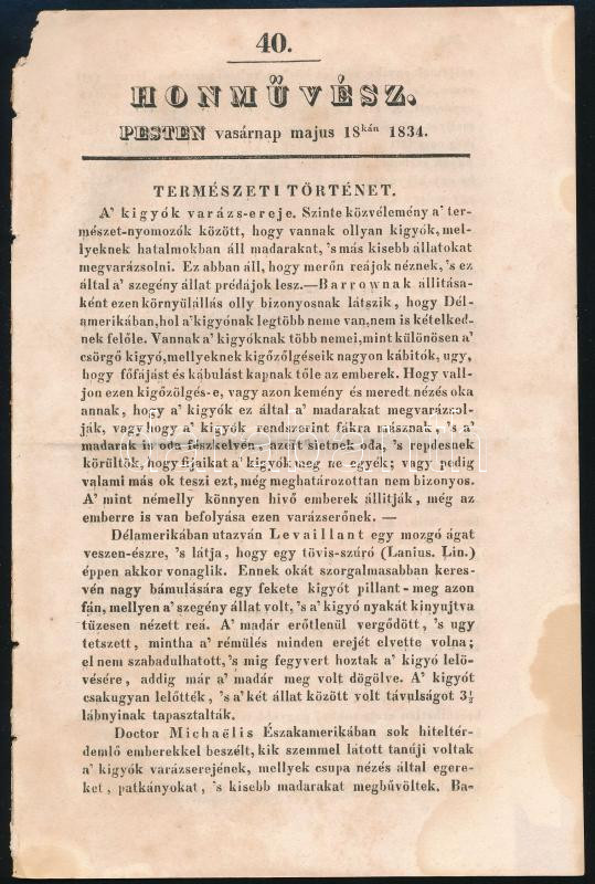 1834 Honművész 40. száma, 1834. május. 18., Pest, Trattner-Károlyi-ny.... https://www.darabanth.com/de/471-Fernauktion/471.0/Kunst-Dokumente-andere-Sammelgebiete/Drucksachen~1000015/1834-Honmuvesz-40-szama-1834-majus-18-Pest-Trattner-Karolyi-ny-Kis-lapszeli-serule~II3131800