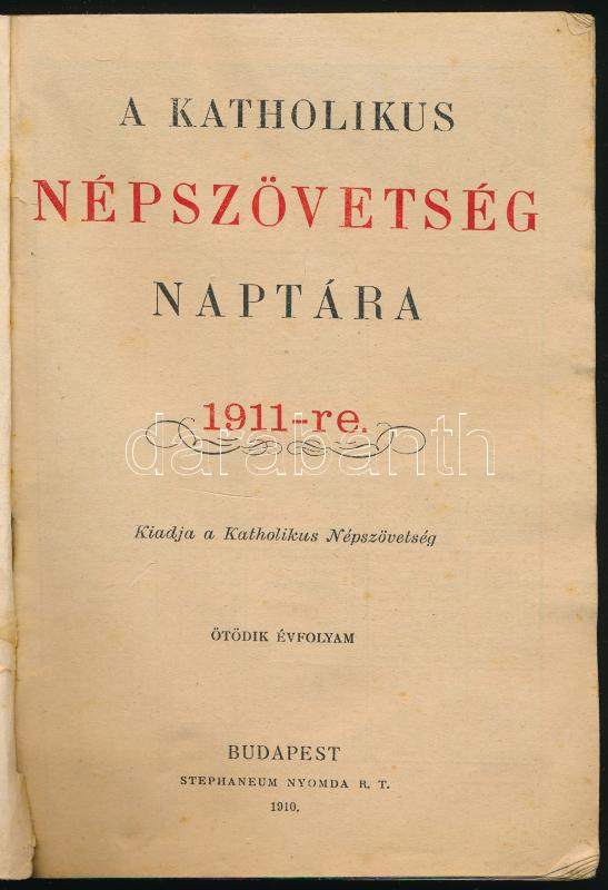 1911 A Katholikus Népszövetség naptára. Illusztrált papírkötésben, fol... https://www.darabanth.com/de/471-Fernauktion/471.0/Kunst-Dokumente-andere-Sammelgebiete/Drucksachen~1000015/1911-A-Katholikus-Nepszovetseg-naptara-Illusztralt-papirkotesben-foltos-boritoval-serC3~II2964038