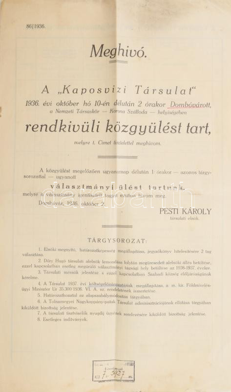 1936 Kaposvizi Társulat közgyűlés meghívó a dombóvári Korona Szállodába, 4 sztl. oldal, apró szakadásokkal, lap alja kissé foltos, néhány kevés ceruzás jelöléssel