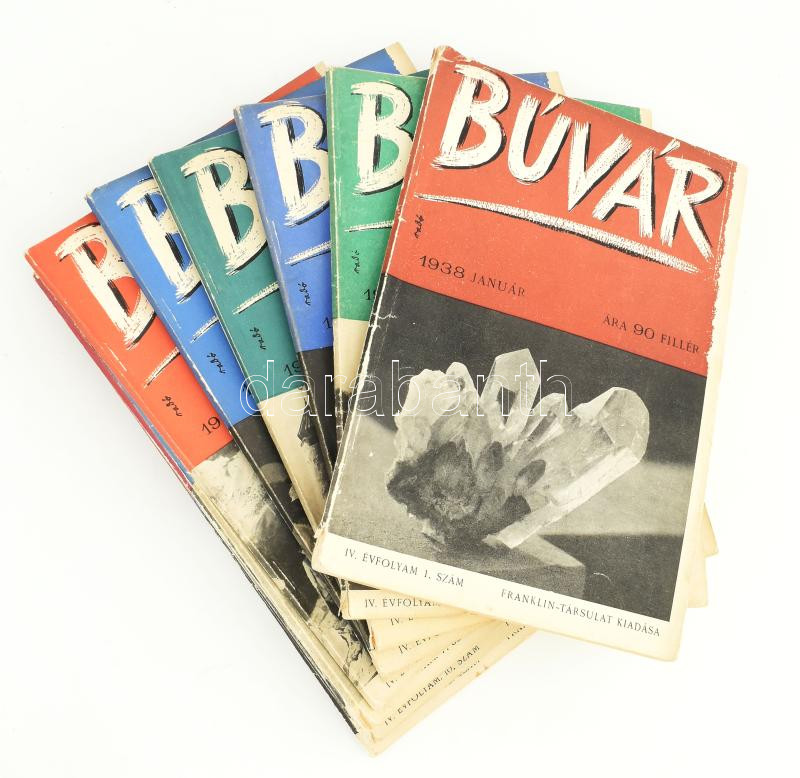 1938 A Búvár c. tudományos folyóirat teljes évfolyama, IV. évf. 1-12. sz., 1938. január-december. Felelős szerk. és kiadó: Dr. Cavallier József. Bp., Franklin-Társulat. Fekete-fehér képekkel illusztrálva. Kiadói papírkötés, változó állapotban.