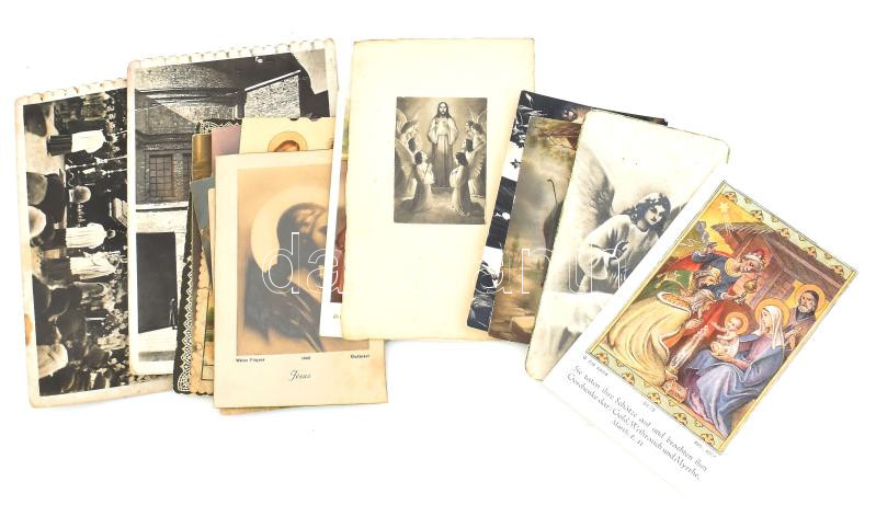 Beschreibung: Vegyes szentképek, 18 db + 2 db Kaszap István temetését ábrázoló fotólap. Változó méretben és állapotban.