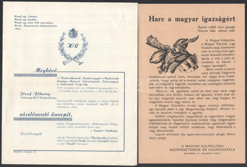 Beschreibung: ca 1935 3 db Revíziós nyomtatvány. Szekszárdi zászlóavatás meghívó füzet, Fiatal magyarság - mindent vissza, Magyar külpolitika - harc a magyar igazságért.