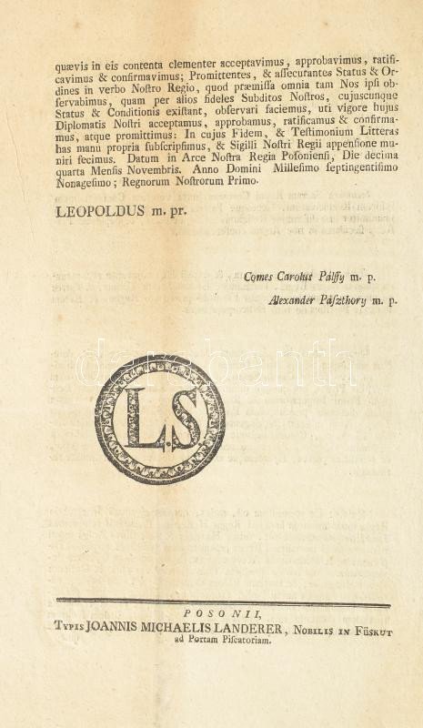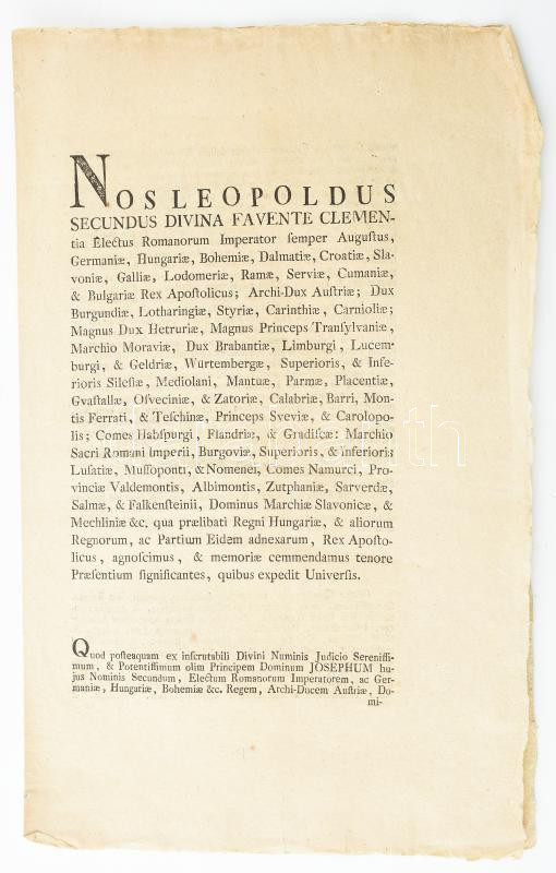 cca 1790 II. Lipót (1747-1792) rendelete a vallási és a nemesek jogainak helyreállításáról. Nos Leopoldus Secundus divina favente clementia electus Romanorum imperator semper augustus; Germaniae, Hungariae, Bohemiae, Dalmatiae, Croatiae, Sclavoniae... Posoniii, Typis Joannies Micahelis Landerer, Nobilis in Füskut ad Portam Piscatiram, 2 sztl. lev.