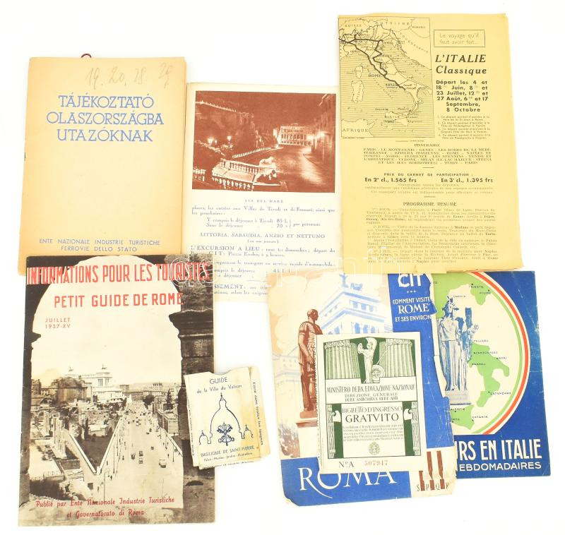 Beschreibung: cca 1930-1940 Róma utazási tétel (össz. 6 db): francia és magyar nyelvű idegenforgalmi tájékoztató, Vatikán mini útmutató, belépőjegy, stb.