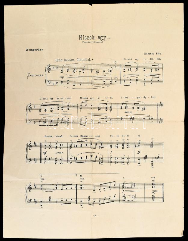 cca 1930 Hiszekegy. Hitvallás, írta Papp-Váry Elemérné verse és a dal ... https://www.darabanth.com/de/471-Fernauktion/471.0/Kunst-Dokumente-andere-Sammelgebiete/Drucksachen~1000015/cca-1930-Hiszekegy-Hitvallas-irta-Papp-Vary-Elemerne-verse-es-a-dal-kottaja-hajtasnyommal~II3193146